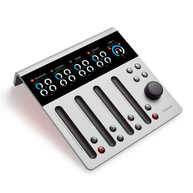 Der Intellimix PRO Desktop-Mixer ist ein vollwertiger 8-Kanal-Mixer mit fortschrittlicher AoIP-Konnektivität als Standard, erweiterten E/As und detaillierten Einstellmöglichkeiten. Intellimix bietet Ihnen die Kontrolle über acht Eingänge mit Kanälen, die in zwei Ebenen angezeigt werden. Es ist als Mischgerät konzipiert, um jede erdenkliche und komplexe 8-Kanal-Mischaufgabe zu meistern. Dank Fernsteuerungsoptionen, Admin-Modus und einer unbegrenzten Anzahl von Benutzerprofilen ist Intellimix PRO ideal für gemeinsam genutzte Arbeitsplätze.Die Grundelemente der Intellimix Control Unit sind die vier G-Touch© Fader, das Multitouch-Widescreen-Display und ein Drehregler. Als völlig neue Fadertechnologie vereint der G-Touch© Fader alle Vorteile der bisherigen Fadertypen auf völlig neue Weise. Sie erhalten eine enorme Reaktionsfähigkeit und physische Orientierung, wenn Sie Ihre Finger durch die geformte Rille gleiten lassen. Nutzen Sie die Möglichkeit, Faderpositionen voreinzustellen und genießen Sie verschiedene Fadermodi und verschiedene LED-Bargraph-Anzeigeoptionen.
